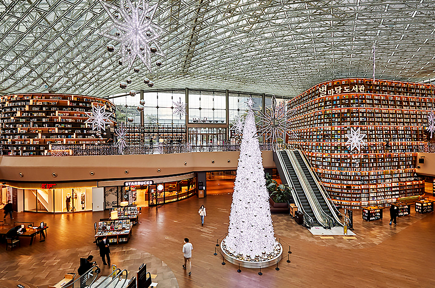 크리스마스트리로 웅장한 장소로 크리스마스트리 아래에서 인생샷을 남길 수 있습니다. 다양한 분야의 작가와 함께하는 북 콘서트가 열려는 곳으로 재미를 느낄 수 있는 곳입니다. 크리스마스 테마 전시도 도서관 곳곳에서 크리스마스 테마의 전시를 만나볼 수 있습니다.